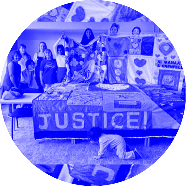 image credit: Tanveer long dark hair in centre with the Sewing For Justice Group, working on the Grenfell Memorial Quilt, 2023, picture by Tuesday Greenidge.